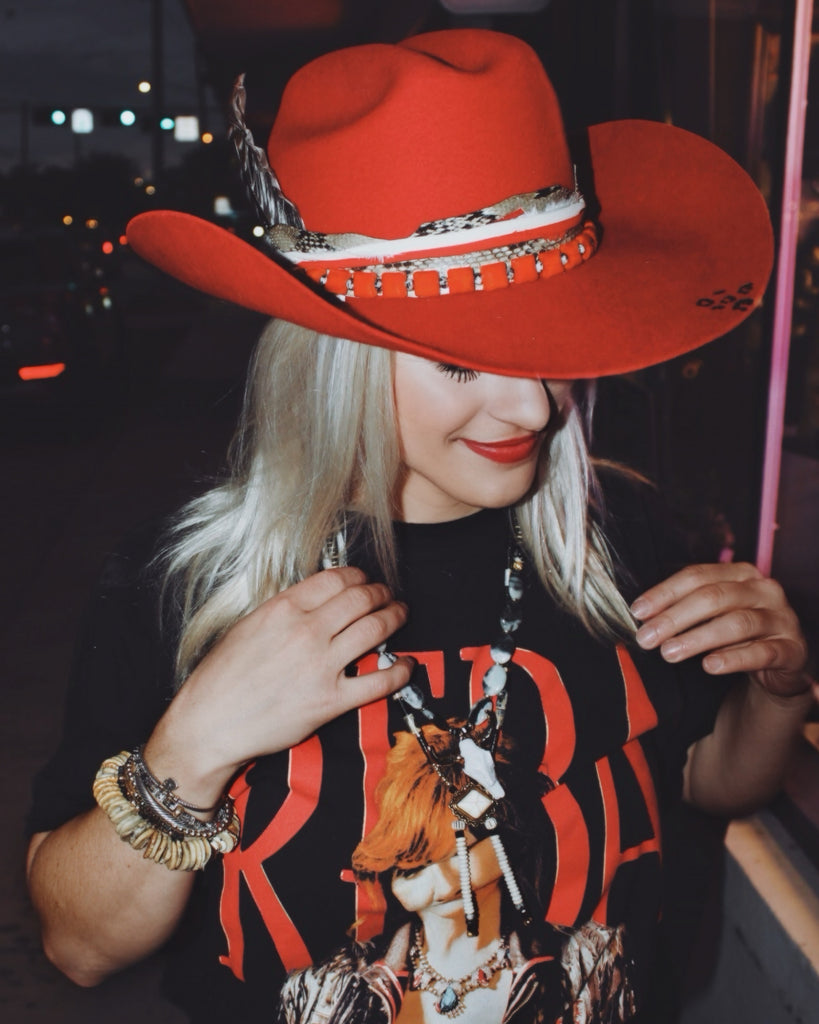 Hand-customized & burned ‘John Wayne’ western brim! Stand-out brim with great textures! 20k gold plated accessories with authentic wild game bird feather bundle Completed with hand-cut, authentic full quill ostrich exotic hide and hand-stitched detailing.