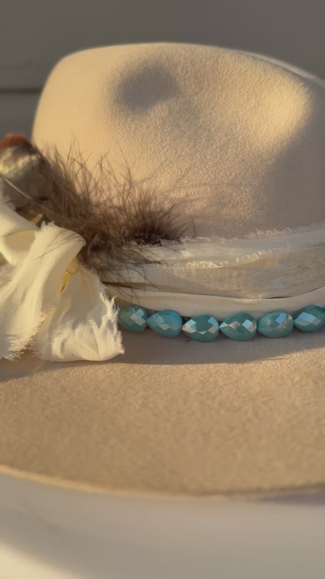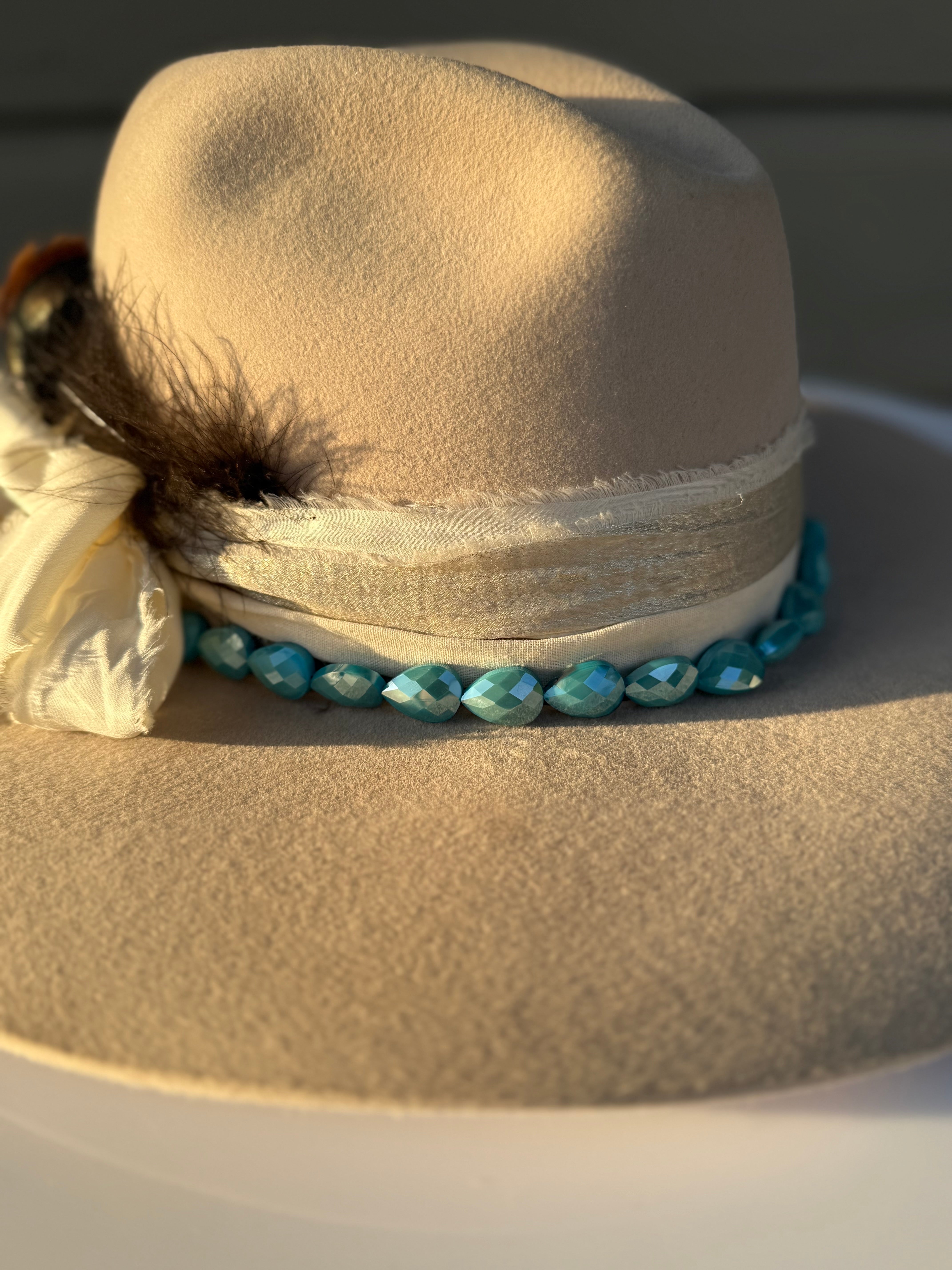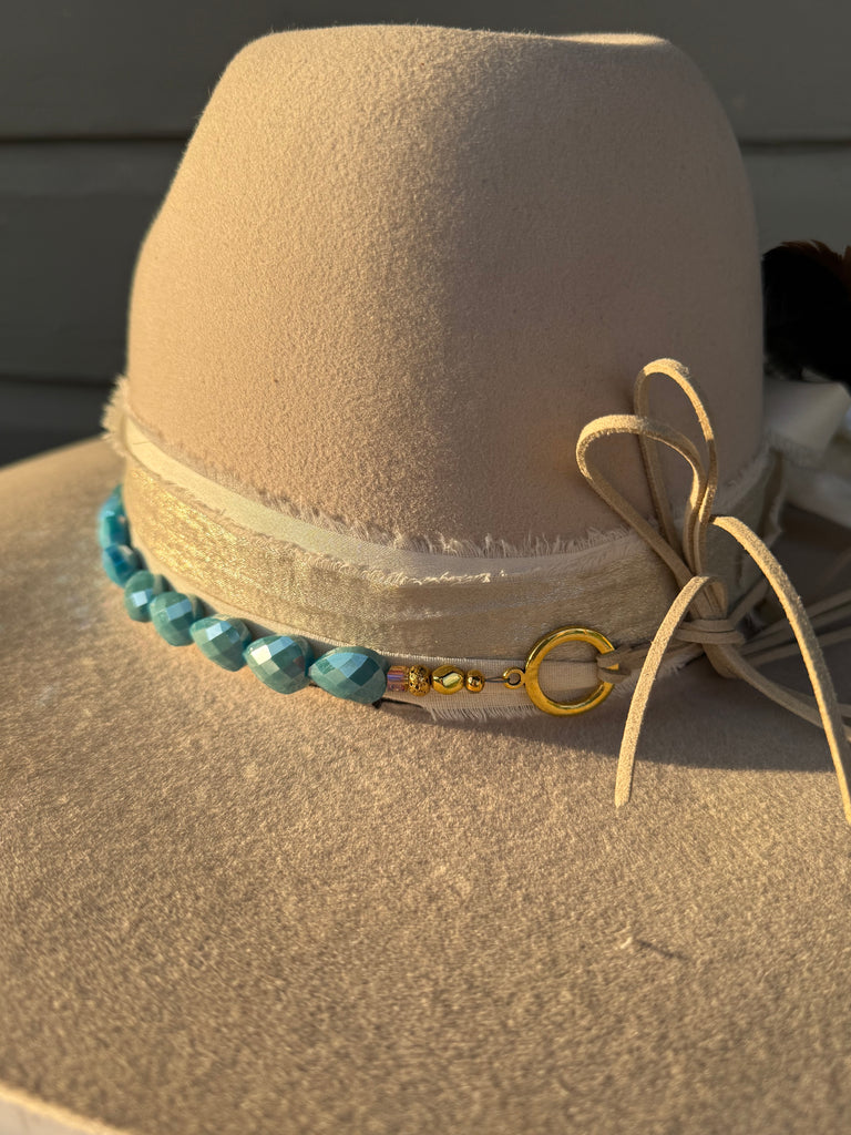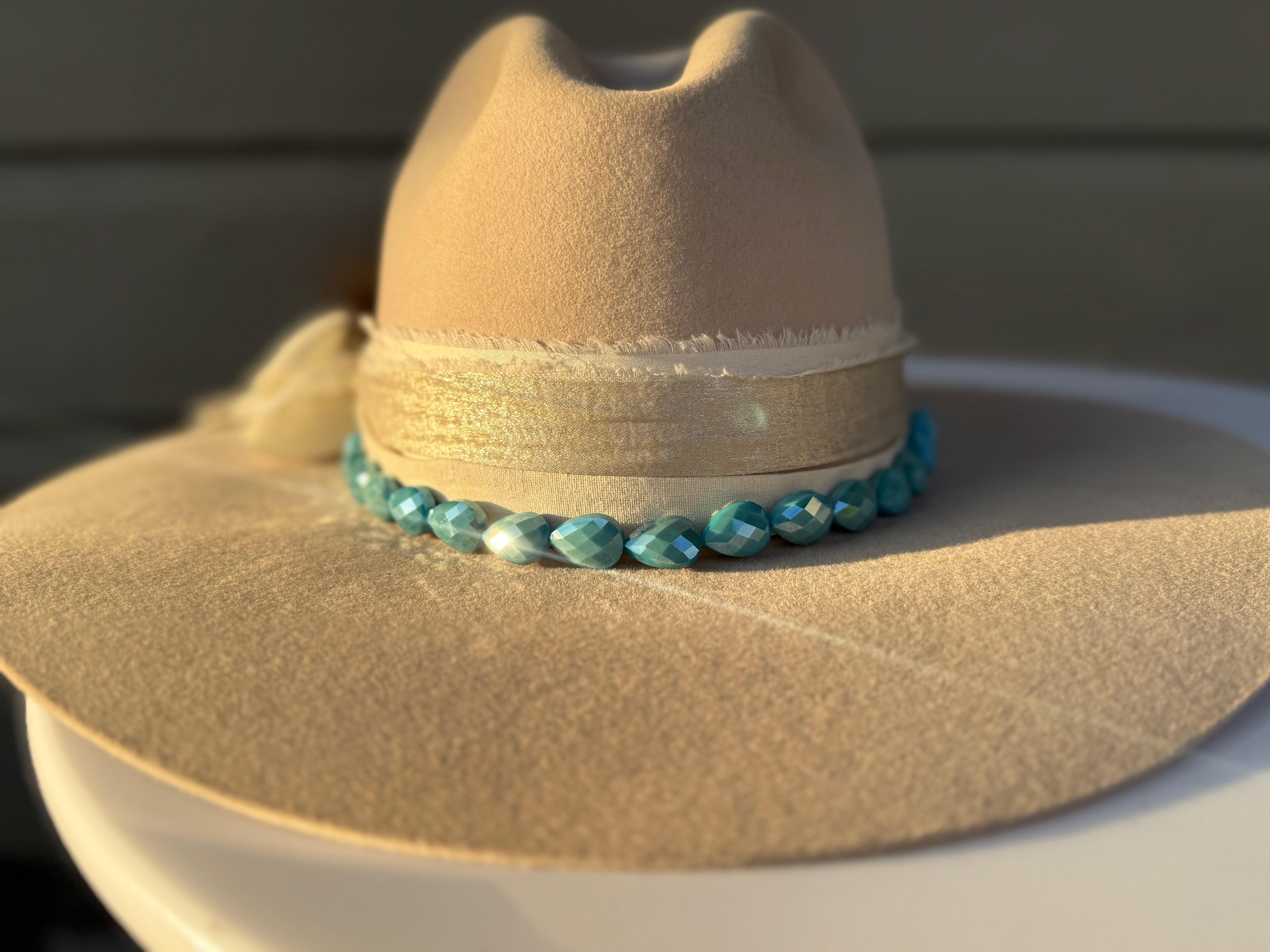 Handmade, iridescent crystal beaded hatband with 20k Gold accents. Adjustable deer buckskin leather suede tie endings to fit any hat!