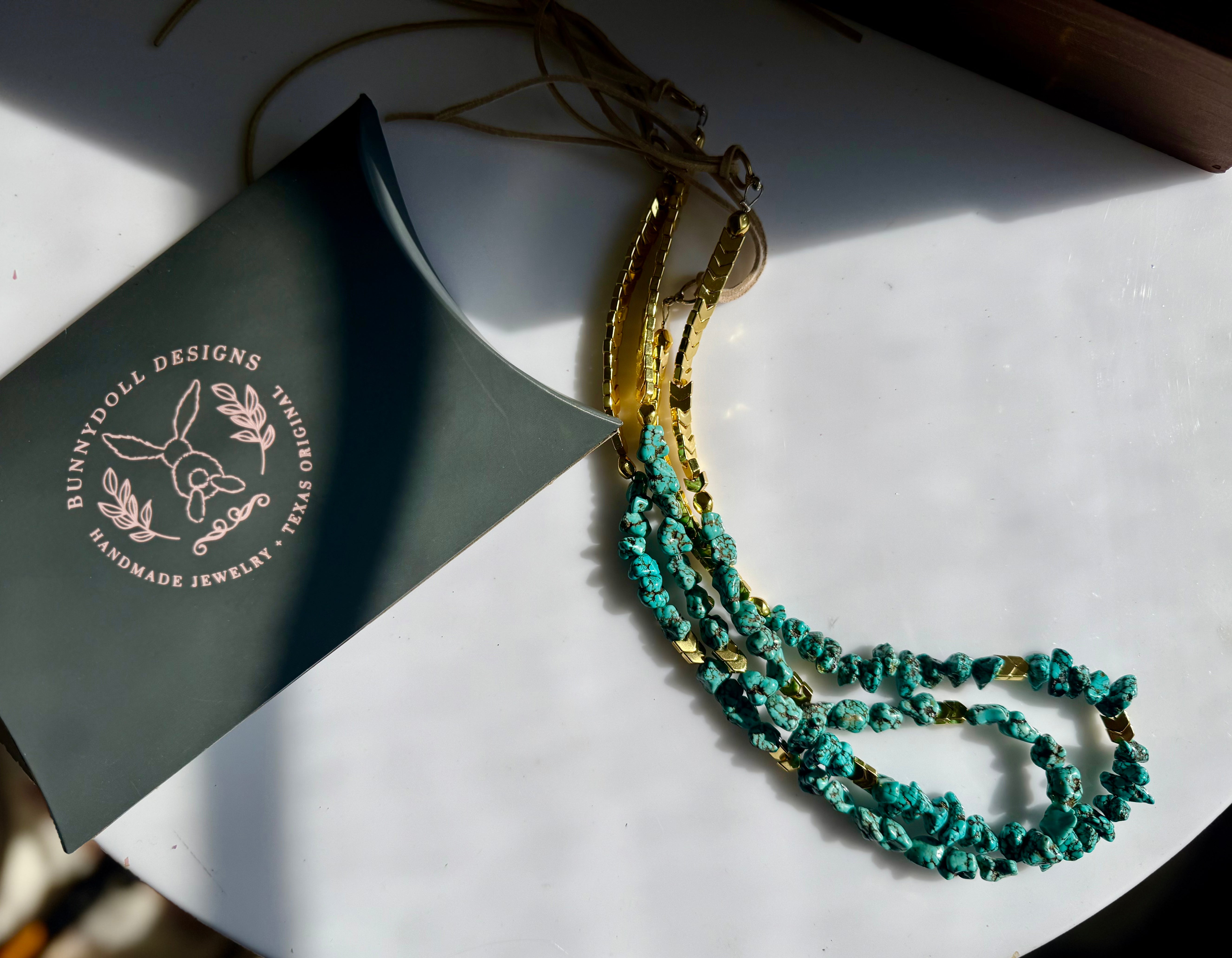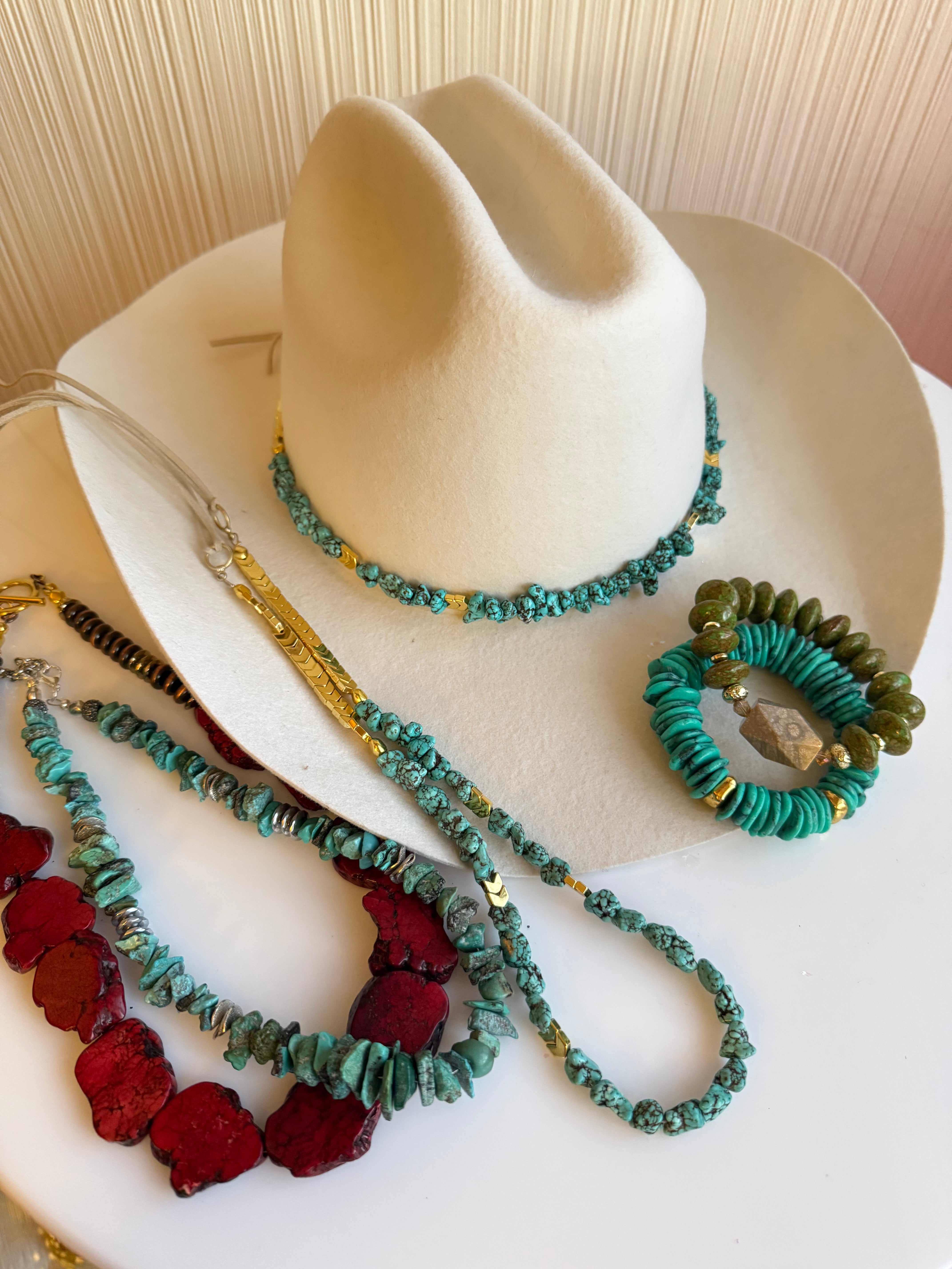 Handmade, Rareform Authentic Turquoise Gemstone Beaded Hatband wtih 20k Gold Hematite accents for non-tarnish wear. Standard hatband length, adjustable suede tie backing to fit any hat!
