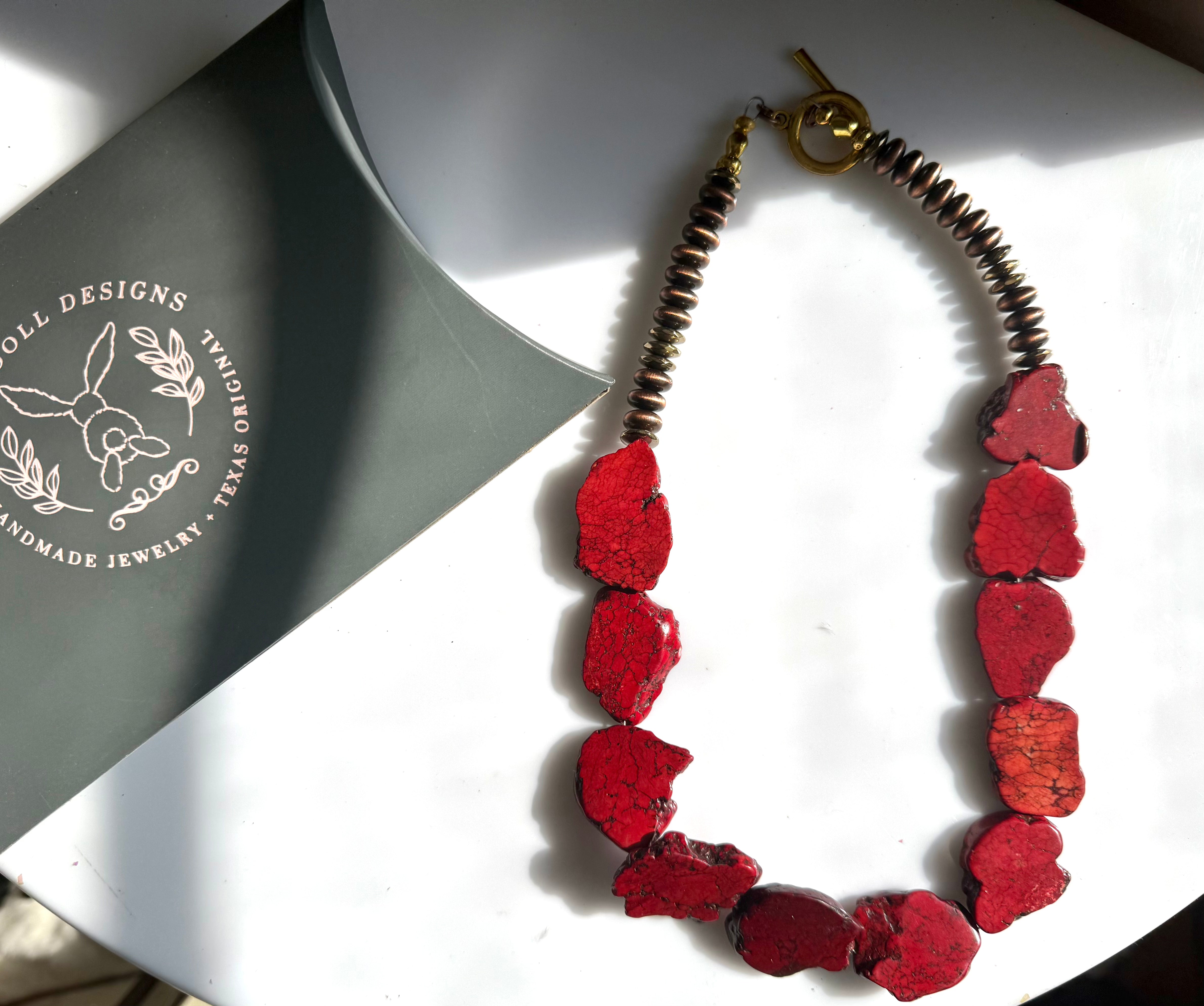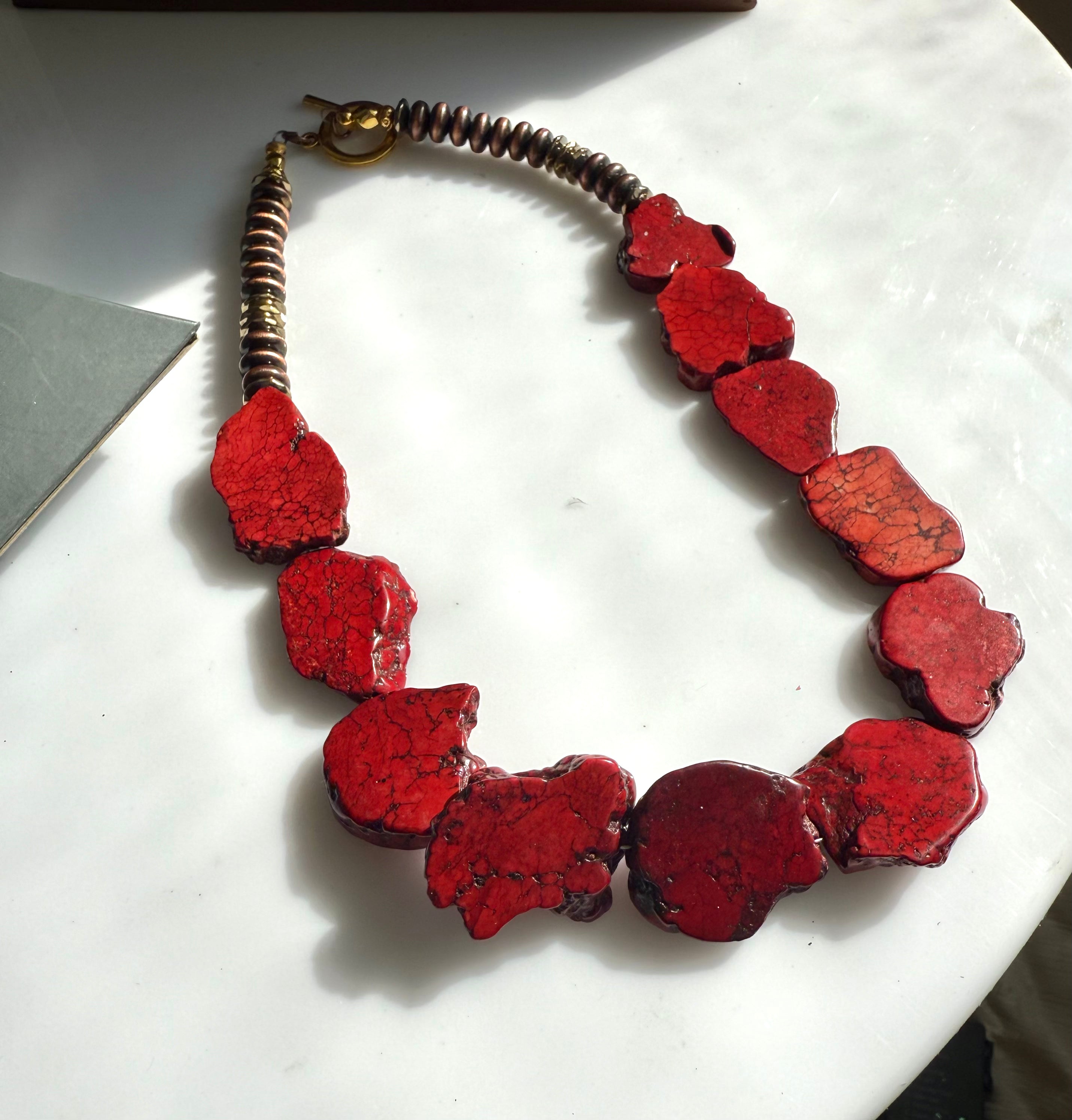Handmade, authentic dyed turquoise gemstone beaded necklace with 20k gold accents.Secured on toggle clasp for easy wear + removal.