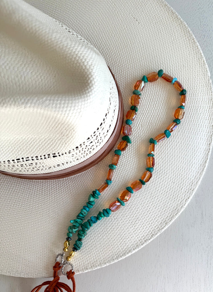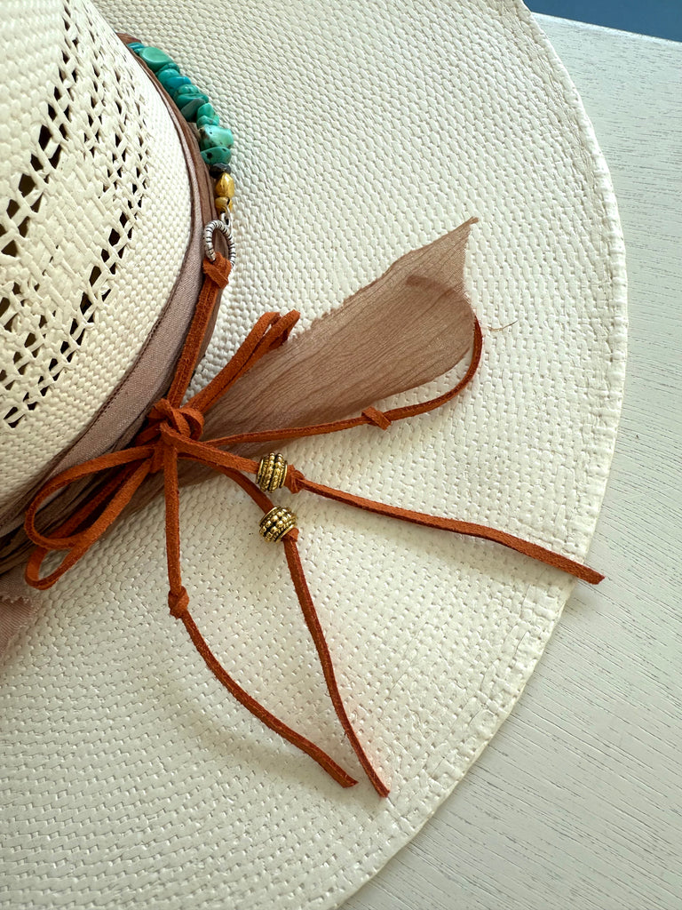 Handmade, Faceted Crystal + Authentic Turquoise Gemstone Beaded Hatband w/ 20k Gold Plated accents for non-tarnish wear. Standard hatband length, adjustable suede tie backing to fit any hat!