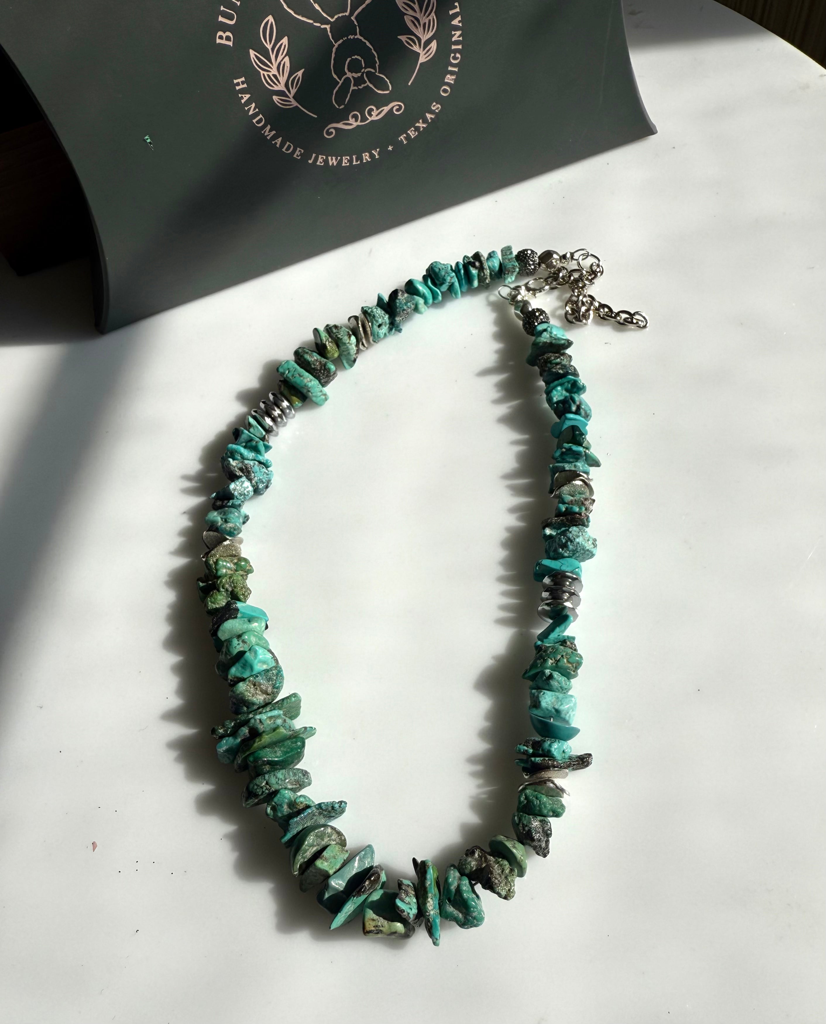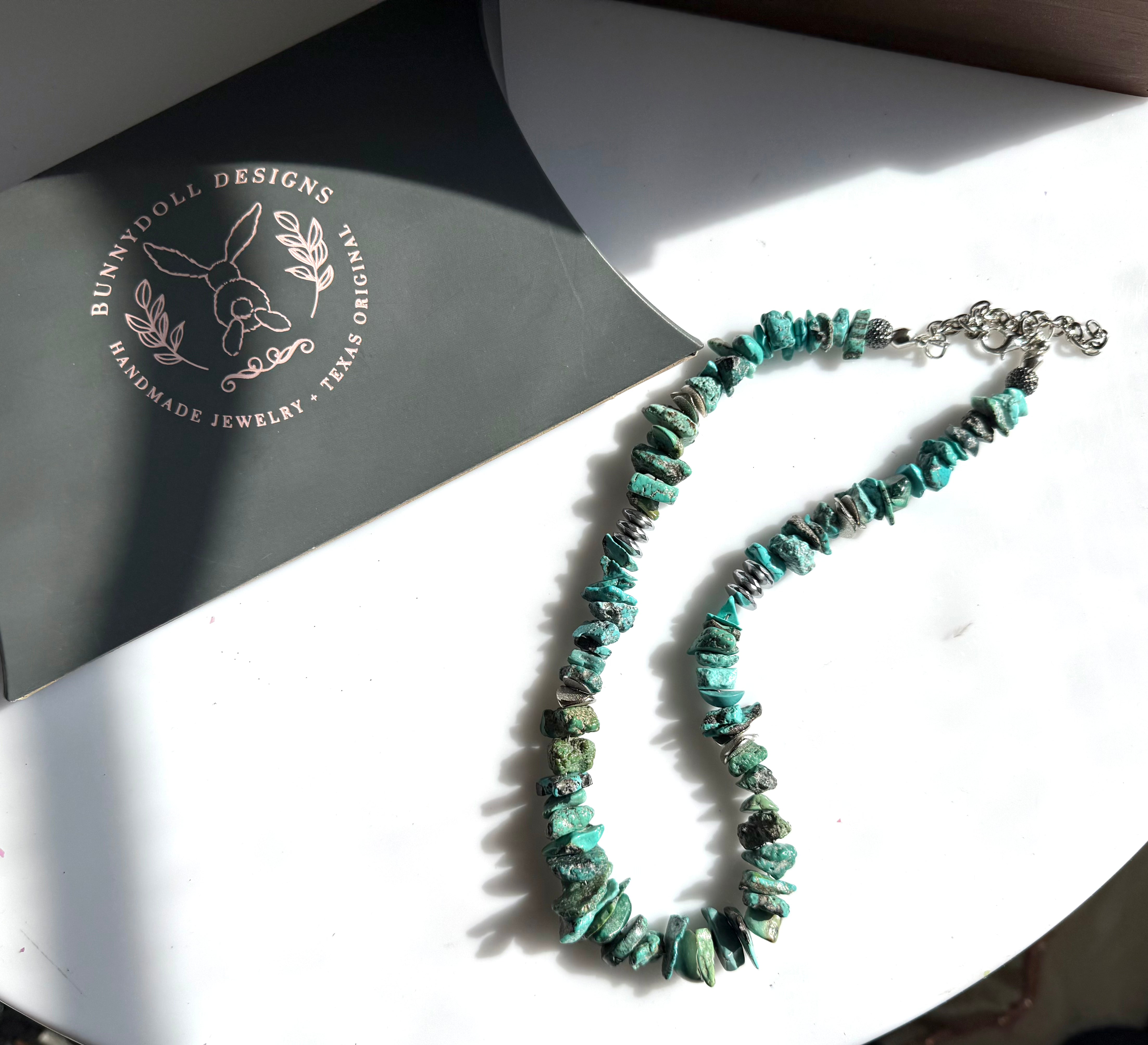Handmade, light weight authentic turquoise gemstone chip necklace with 20k silver shimmering plate accents. Secured on lobster adjustable chain clasp for easy wear + removal